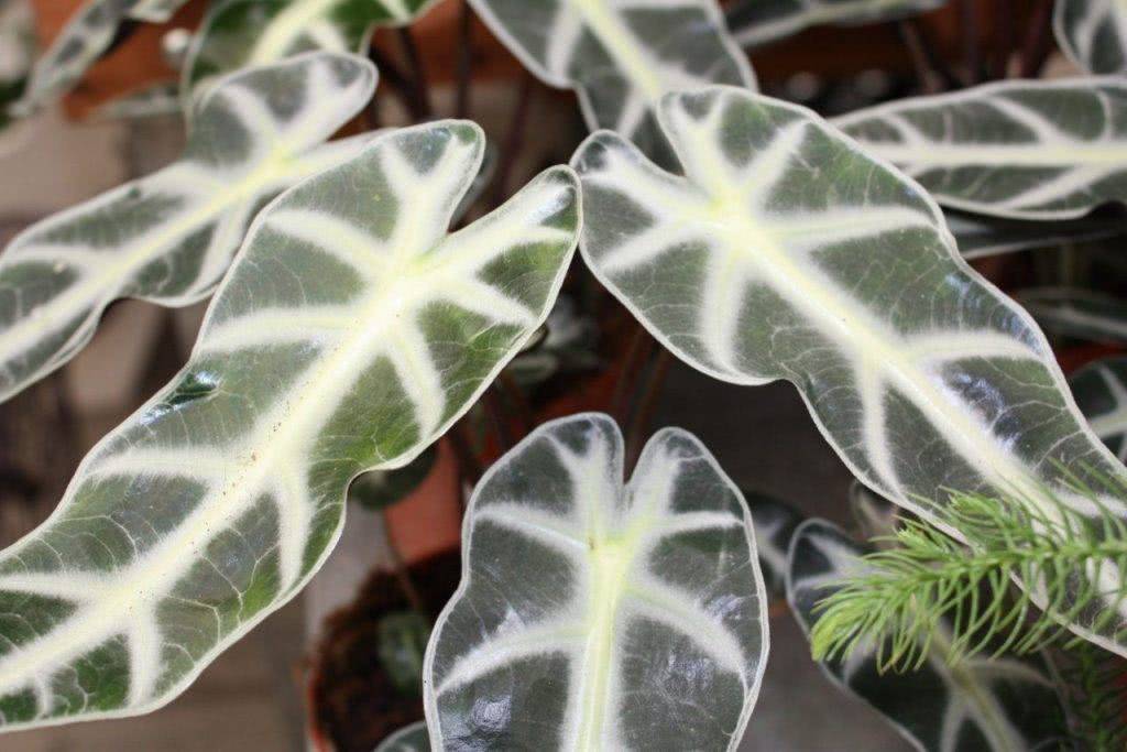 - Алоказия пахучая. Отличается этот вид крупными яркими листьями с белыми пятнами.
