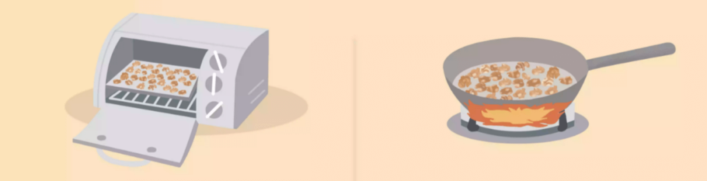 - Обжарка или кипяток. Достаточно поместить орех на 5-10 минут в условия повышенной температуры, чтобы оболочка сошла. Однако этот способ опасен тем, что перегрев разрушает витамины в ядре ореха, и он становится менее полезным и питательным.