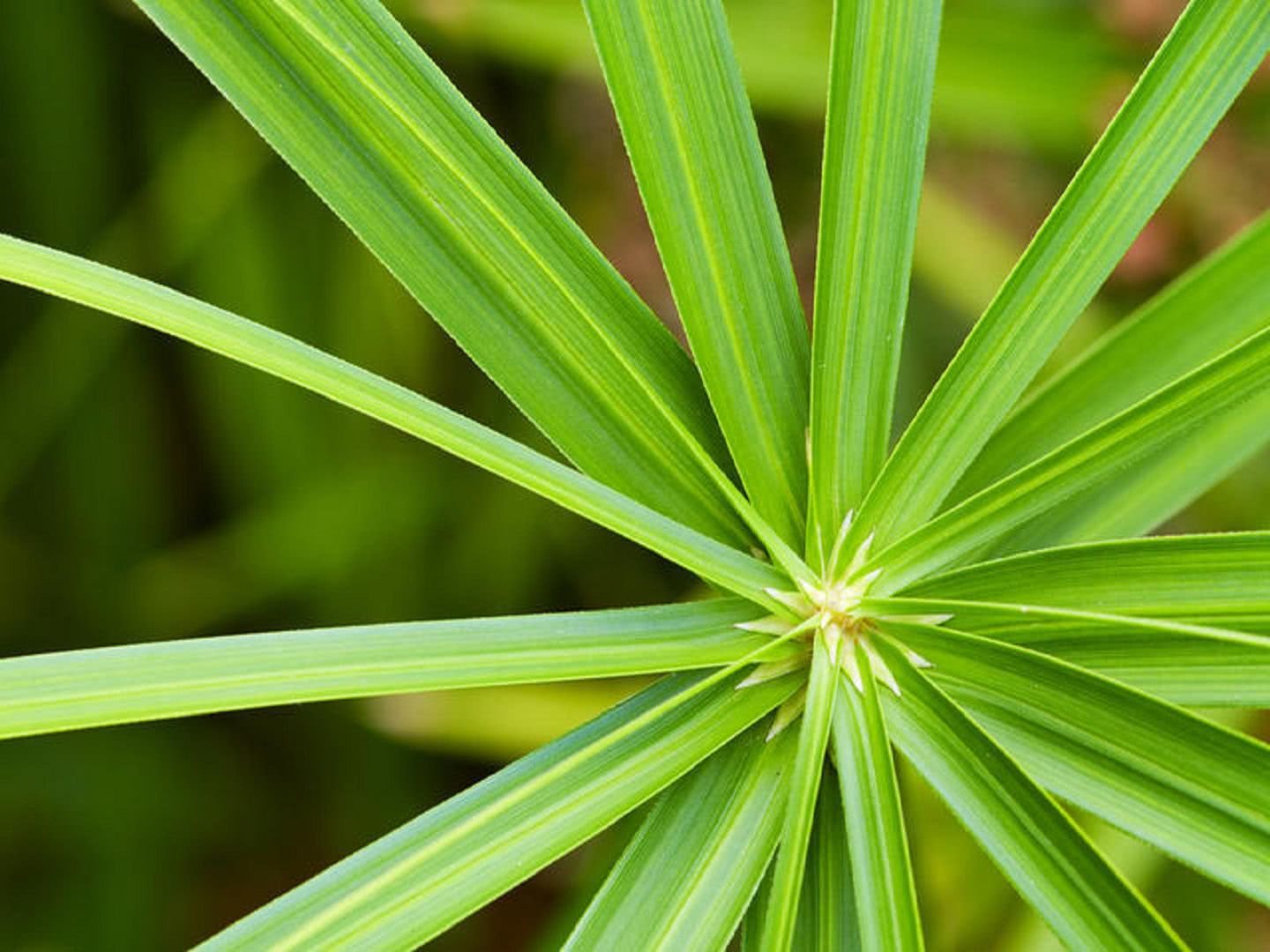 - На верхушках стеблей розетки листьев—лучей, образующих зонтики. Листья циперуса разной длины, из-за чего растение смотрится пышнее.
