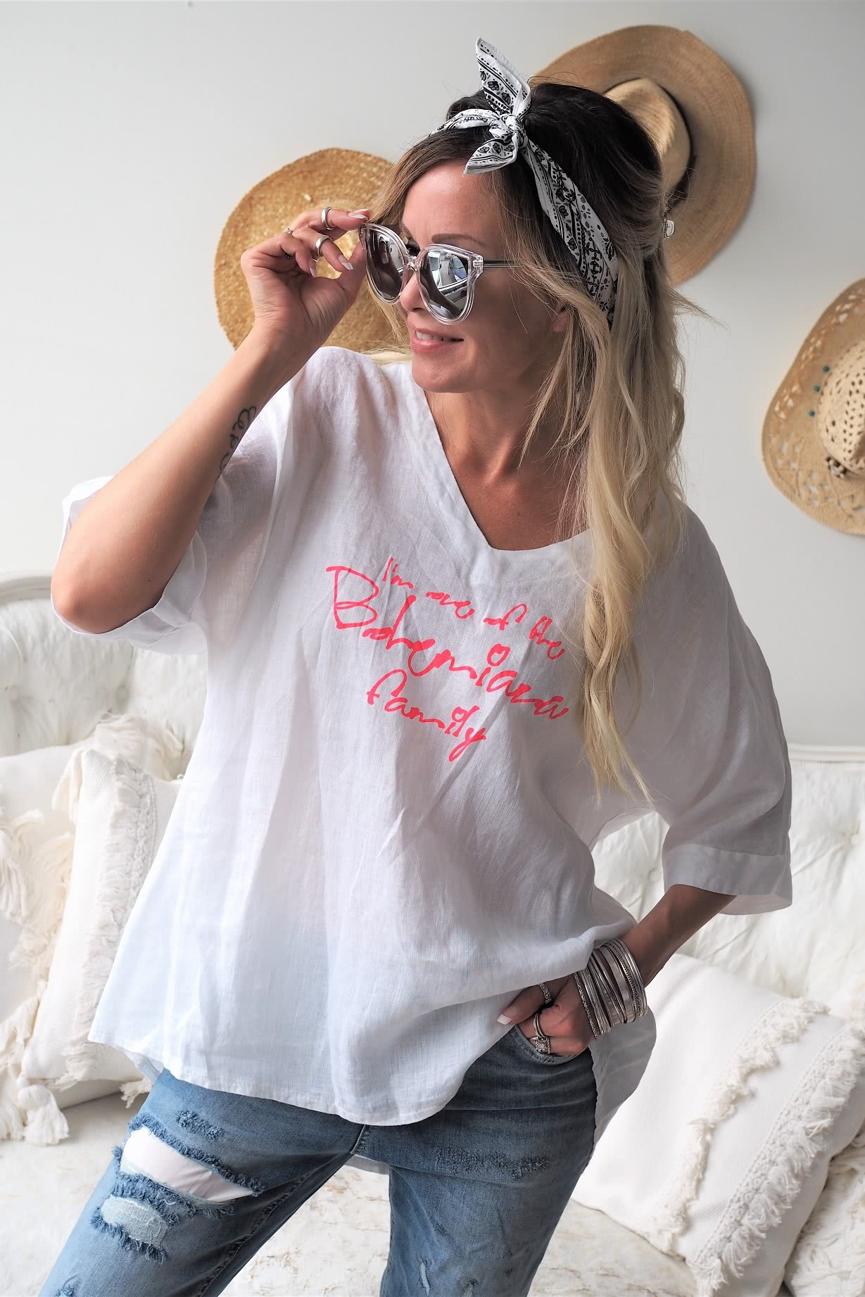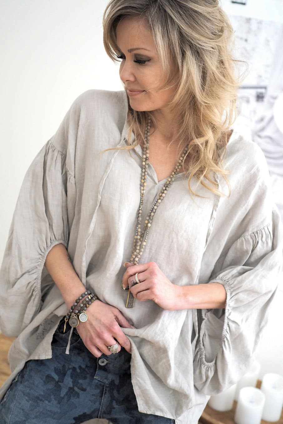 Для делового бохо-лука подходит сочетание классических джинсов со свободной туникой, дополнит образ крупное металлическое или деревянное украшение, например, браслет.