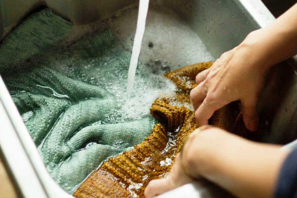 - Замочите вещь в прохладной воде на 10-15 мин, дав жидкости полностью впитаться в нити.