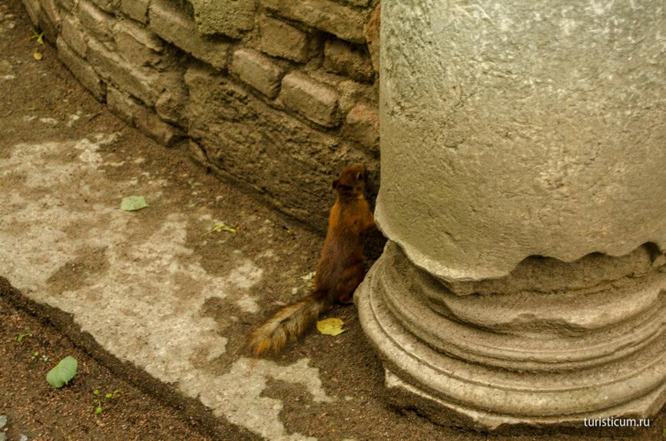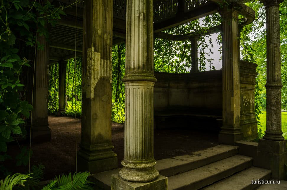 Гуляя по Пейзажному парку мы пересекли Рамповую аллею, которая ведет к Камероновой галерее. А по дороге мы увидим Гранитную террасу. Хочется признаться, что все названия и местоположения павильонов и аллей мы подсмотрели в бесплатной карте, которую выдают в кассах вместе с билетом в парк, поэтому вы не останетесь без спасательного ориентира.
