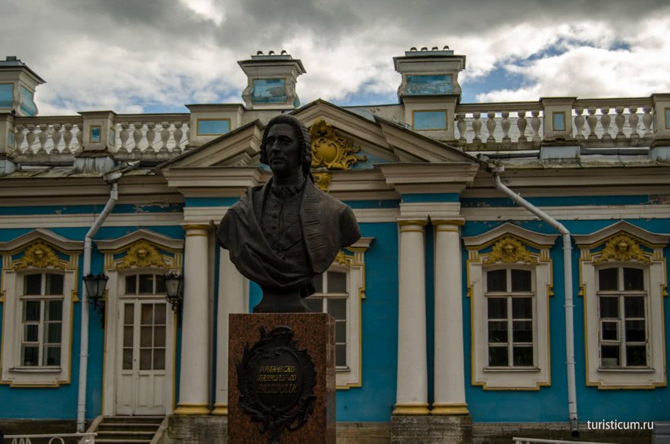 Екатерининский дворец назван так в честь императрицы Екатерины I, по приказу которой здание и было заложено в 1717 году. Поместье Саарская мыза стало подарком Петра I своей супруге, ныне это Царское село. Дворец был загородной резиденцией трех Российских императриц: Екатерины I, Елизаветы Петровны и Екатерины II. Каждая из императриц внесла что-то свое в облик Большого Екатерининского дворца. Нынешний вид дворца дело рук знаменитого архитектора Бартоломео Франческо Растрелли, бюст которого установлен с северной стороны дворца.