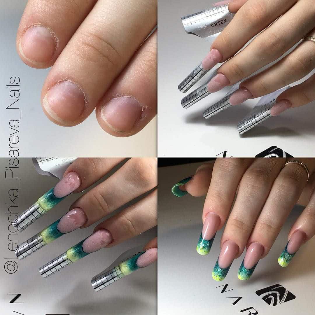 Но главное отличие в том, что качественные типсы достаточно гибкие, чтобы не сломаться, а специальные клеевые составы держат их на ноготках долгое время. После того, как типсы приклеены, мастер придаёт пластине необходимую форму и делает дизайн на длинных ногтях.