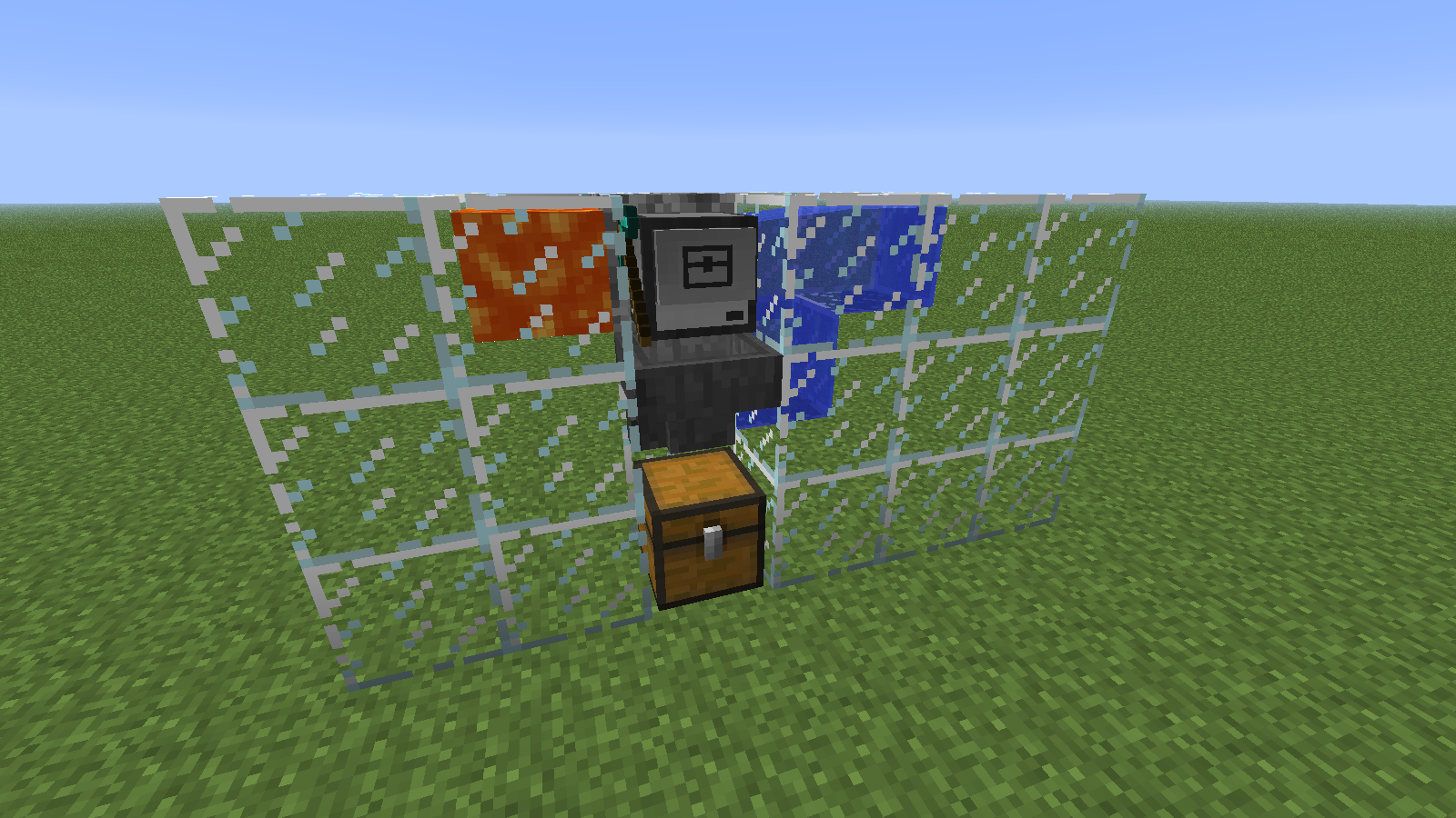 Всё. Что должно было получиться? Бассейн с водой, в который сверху льётся лава сразу в пять ячеек. Под ними расположены воронки. Через них образующийся булыжник сразу попадает в сундук.