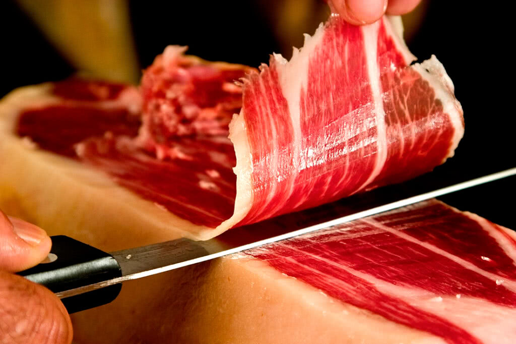Считается, что механическая нарезка ухудшает качество хамона. Ручная нарезка — настоящее искусство и требует мастерства. Для этого используется хамонера — деревянное приспособление длиной 45-50см. и шириной 15-20см. и специальные ножи. Очень важна толщина отрезанного кусочка. Чем тоньше, тем лучше. Плохой нарезкой можно испортить качество дорогого хамона, а хорошей — поднять качествого дешевого. На срезе у качественного хамона мелкие белые точки. Это тирозин, аминокислота мясного белка. Он доказазывает, что в мясе низкое содержание соли и готовили его правильно. Место среза покрывают срезанным жиром, тканью или оливковым маслом. Желательно употребить окорок в течение 3 недель. Это, в среднем, 80 грамм палеты в день и 150 грамм хамона.