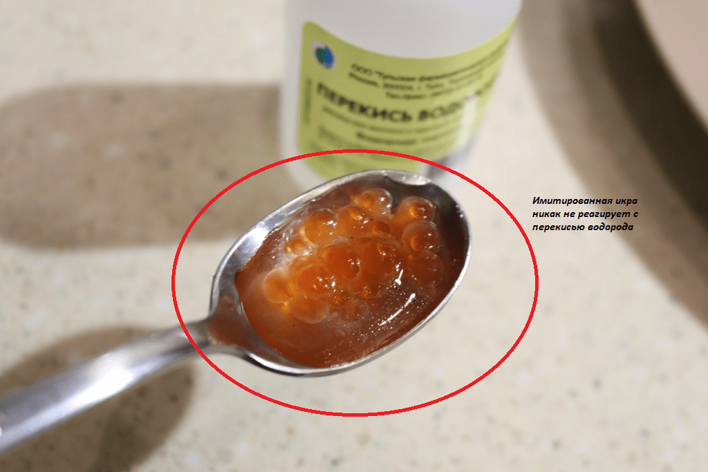Перекись водорода в качестве окислителя вступает в реакцию с белком, имеющимся в составе натуральной икры. И белок, если он есть в икринках, сворачивается, как под воздействием горячей воды.