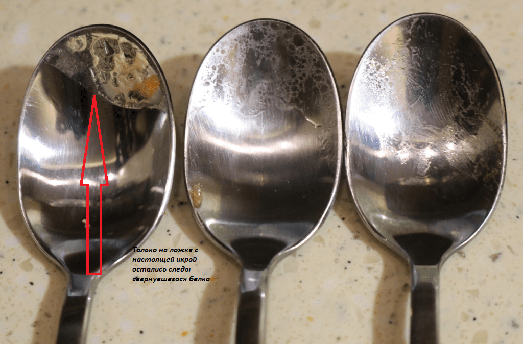 Белые хлопья свернувшегося белка означают, что икра настоящая. В ложке с поддельной икрой белый налет будет незначительным или отсутствовать вовсе.