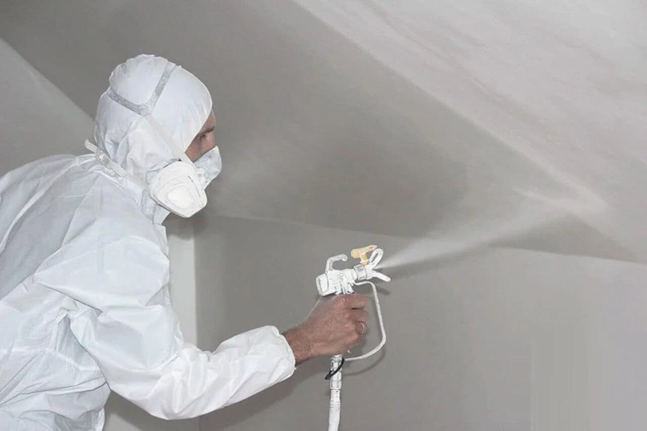 Подготовив помещение, одевается респиратор, являющийся обязательной частью экипировки, и, можно приступать к очистке плоскости потолка от старого покрытия. Его необходимо удалить как можно чище.