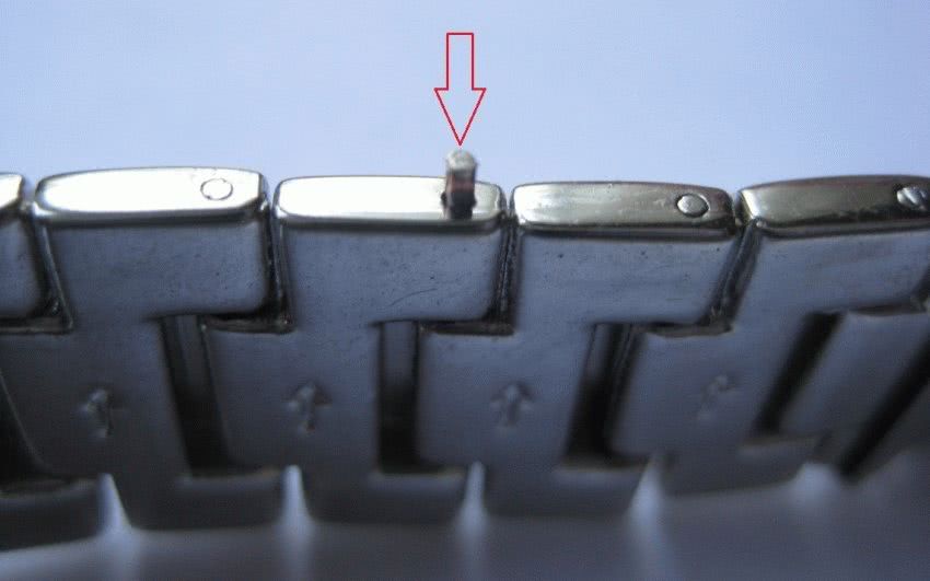 Идем дальше. Звенья, которые можно снять, специально маркируются производителем с внутренней стороны небольшими стрелочками. Именно эти стрелочки и указывают, в какую сторону нужно выталкивать соединительные штифты. В зависимости от конструкции браслета, на месте штифтов могут быть пины, имеющие форму буквы L, или же оттягивающиеся спрингбары.
