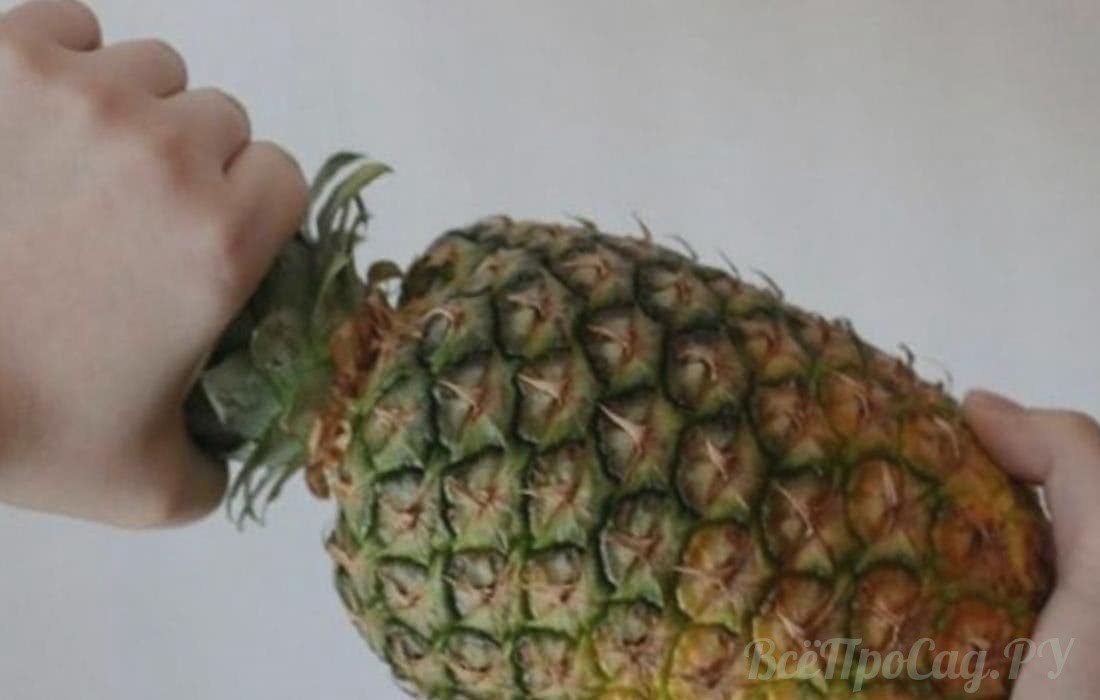 Наилучшим способом отделения верхушки от плода будет выкручивание. Стоит отметить, что этот способ не всем под силу. Выкручивание представляет собой отделение верхушки от плода путем ее скручивания в руке. По итогу, должна получится верхушка с ровным желтым кругом посередине, отсюда и будут расти корни.