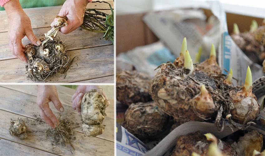 С клубней нужно полностью удалить остатки сухих листьев. Это делают через несколько дней с начала хранения. После чего, примерно через неделю, удаляют и корни. К этому времени корни будут отделяться легко. Сделать это нужно для того, чтобы цветок не начал преждевременный рост, не находясь достаточно времени в «прохладном покое».