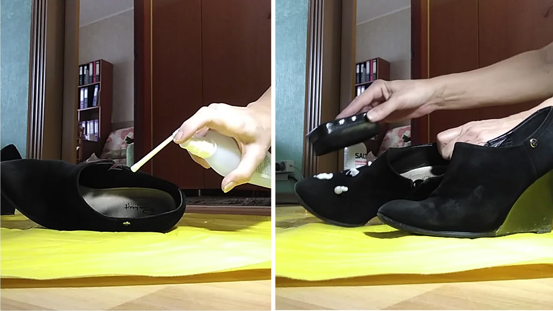 - Чистую пару из кожи обрабатывают обувным кремом, из замши — специальным спреем.