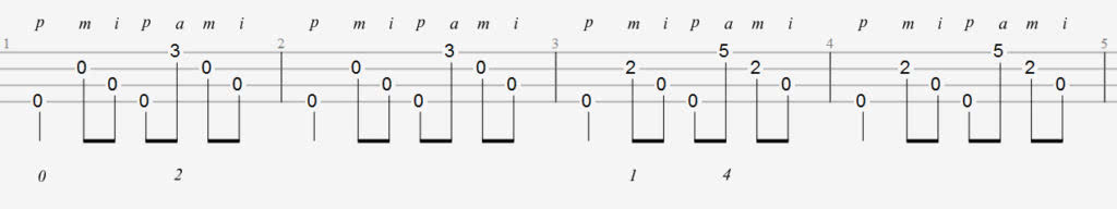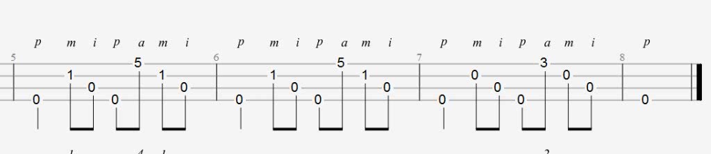 Перебор является уже более сложным видом звукоизвлечения, так как требует не только чувство ритма, но и отличную мелкую моторику рук. Развивать координацию, технику и постановку пальцев лучше под присмотром педагога на уроках обучения игры на укулеле. Перед тем, как играть перебором необходимо изучить постановку пальцев. Каждый – должен отвечать за определённую струну, также, как и при игре на акустической шестиструнной гитаре. Большой палец – отвечает за басовую четвертую струну. Указательный палец должен дергать третью, вторую – безымянные, а самую тонкую, первую – мизинец.