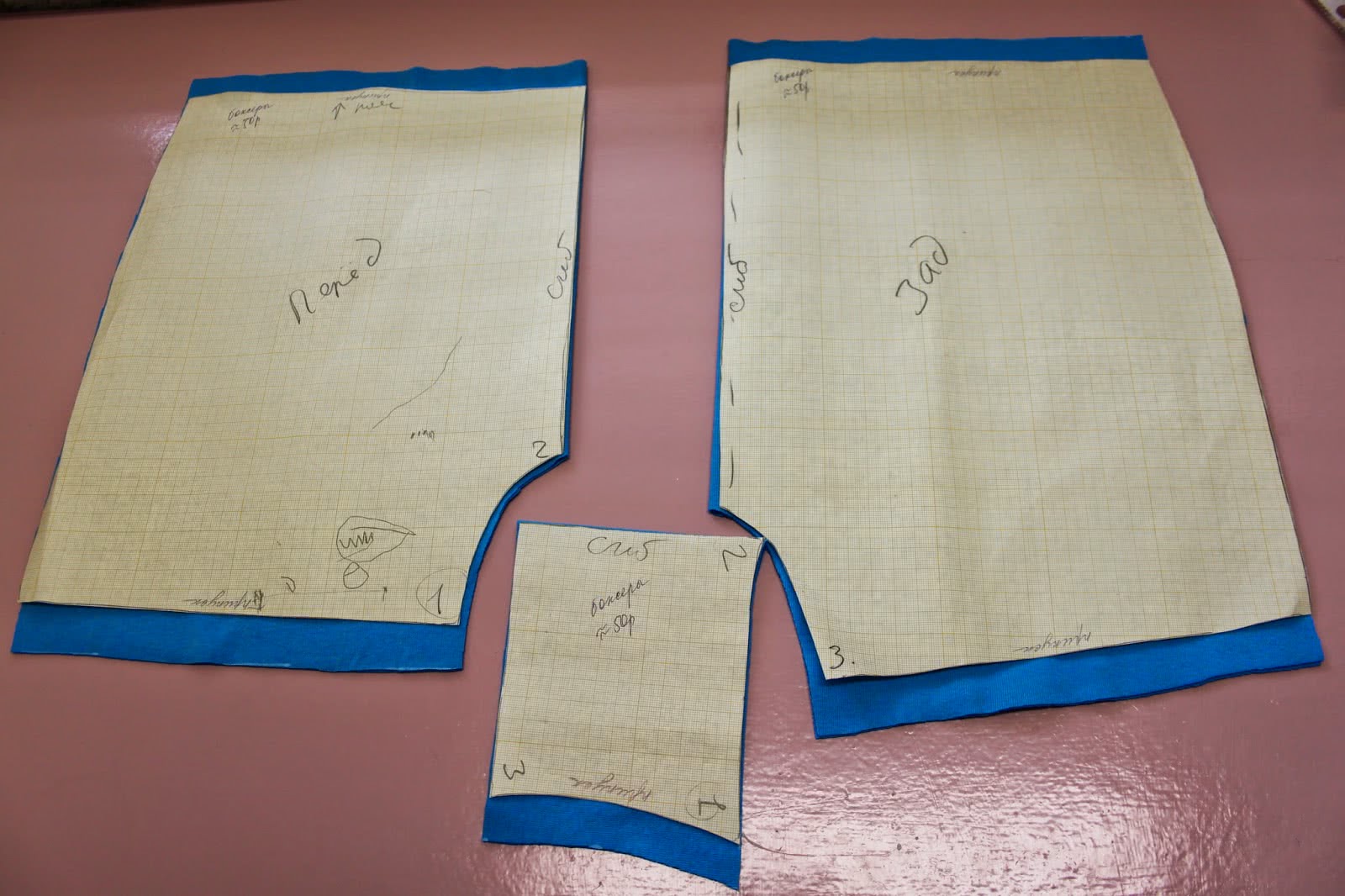 В процессе раскладывания готовых лекал передней и задней частей изделия следует точно соблюдать правильное направление долевой линии, как на лекалах, так и на материале. Лучше всего будет указывать стрелочками направление долевой линии для разной ширины ткани.