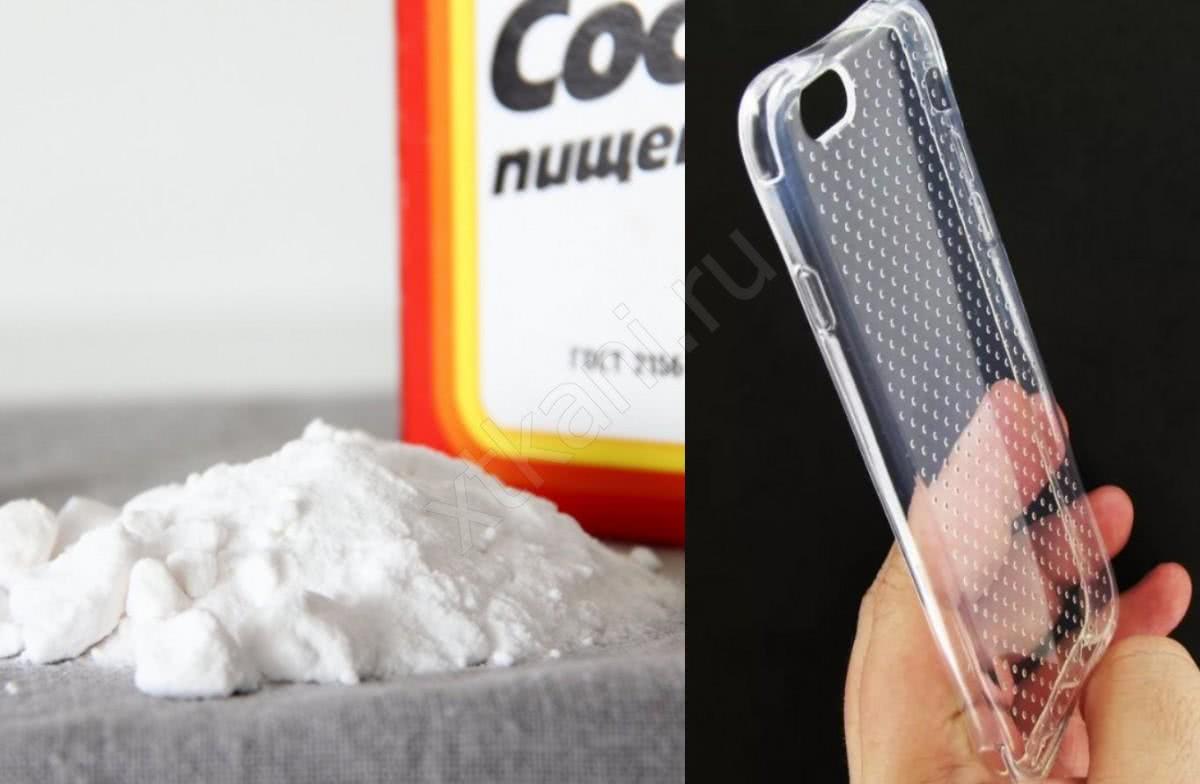 С бесцветного чехла желтизну можно вывести с помощью соды. Способ ее применения: