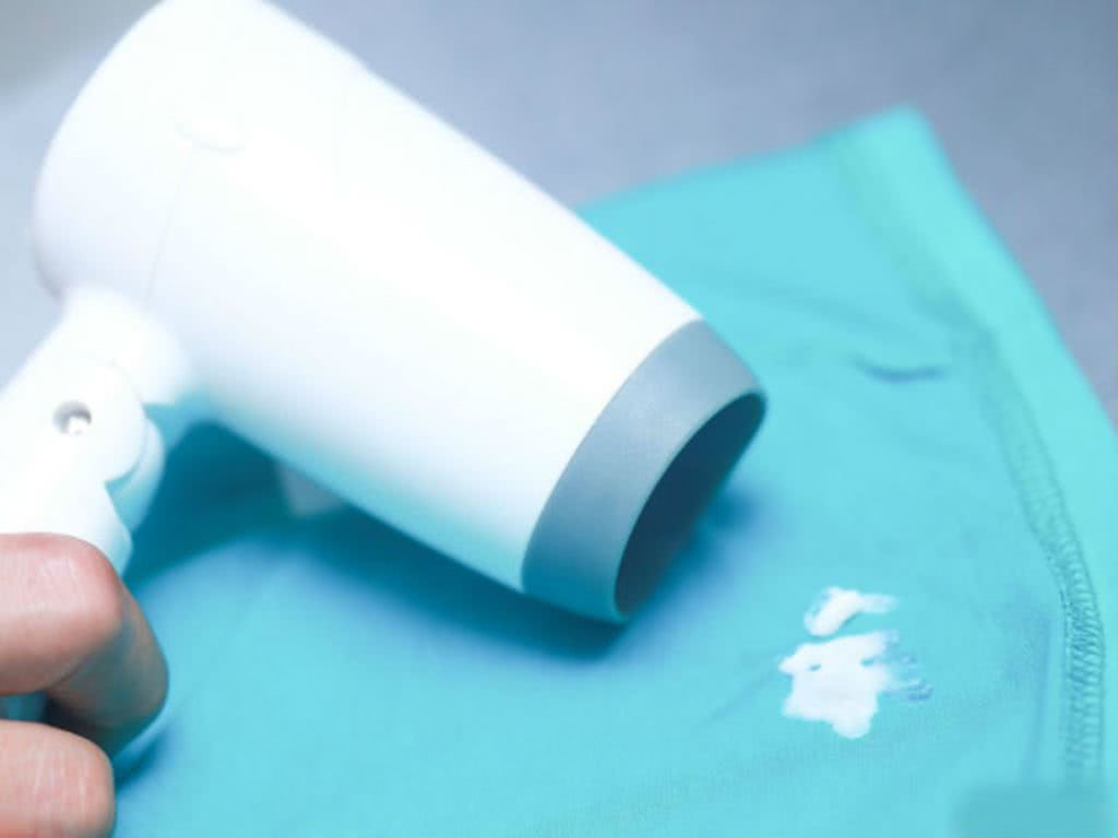 - Подложите защитный слой из плотного картона и нескольких слоев салфетки под пятно. На ткань также положите пару салфеток или полотенец. Сверху постелите хлопчатобумажный отрез ткани и проглаживайте утюгом. Или прогревайте феном.