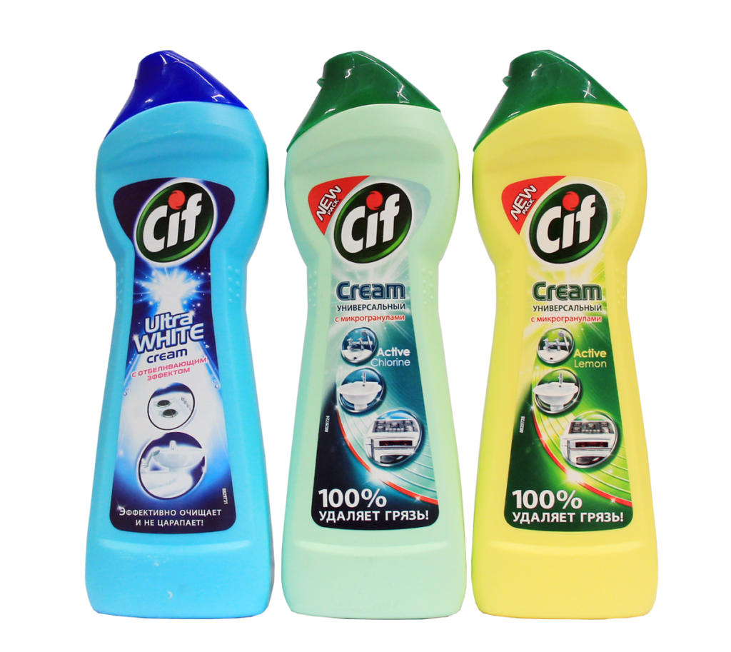 - «Cif» – предназначен для чистки раковин, ванн, кафеля и газовых плит. Это средство можно приобрести в виде крема и в виде спрея. Для того чтобы отчистить стальную ванну, необходимо нанести «Cif» на поверхность ванны, подождать несколько минут, затем потереть губкой, а потом вымыть ванну чистой проточной водой.