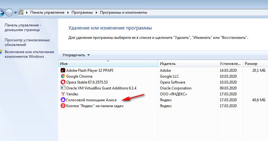 Откроется обозреватель софта, установленного на вашем ПК. Найдите среди них Алису и выделите одинарным щелчком мыши. Затем удалите, нажав нужную клавишу на экране.