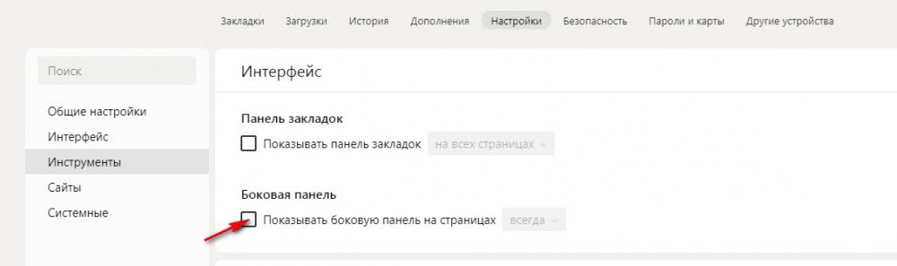 4. Найдите блок «Боковая панель». Если отключена опция «Показывать боковую панель… », включите её, чтобы кнопки управления голосовой помощницей появились в интерфейсе браузера.