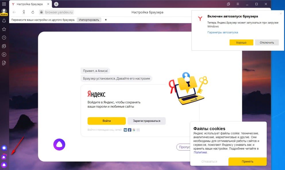 7. По завершении инсталляции в окне Яндекса задайте настройку автозапуска, использования cookies. Кнопки управления помощником отобразятся в панели слева: «Поиск», «Навыки», «Алиса».