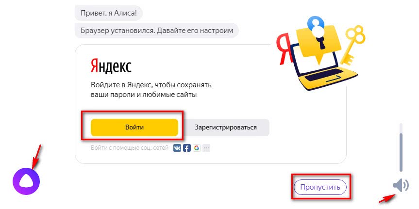 8. Кликните «Динамик» и настройте уровень громкости. Если вы используете аккаунт Яндекс для синхронизации данных в браузере, нажмите в панели «Войти». Авторизуйтесь. Для запуска без входа выберите «Пропустить».