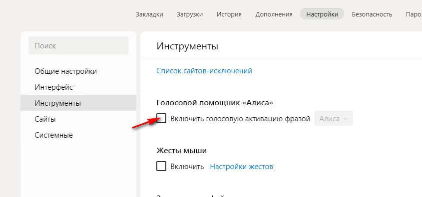 5. Перейдите в раздел настроек «Инструменты». Поставьте «галочку» в строке «Включить голосовую активацию фразой», чтобы управлять помощником через микрофон. В надстройке установите «Алиса».
