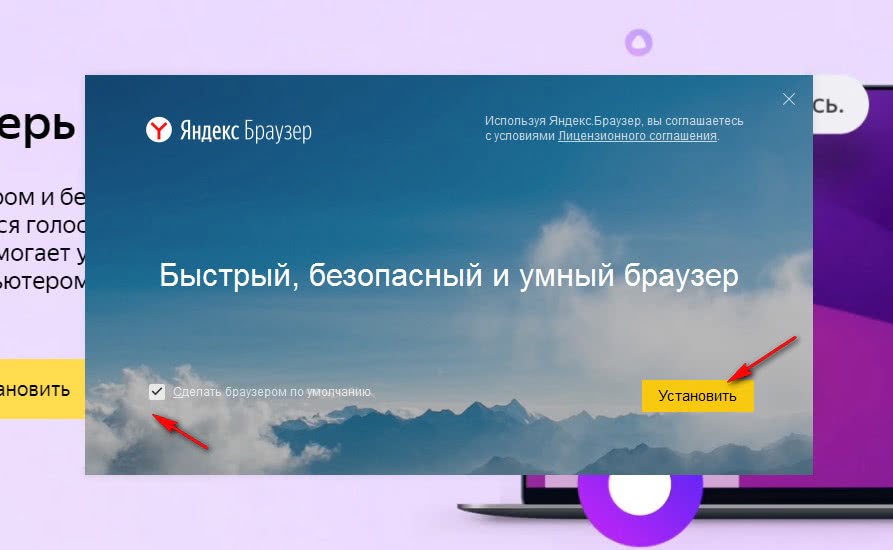 Совет! В окне установщика не забудьте снять «галочку» в строке «… по умолчанию», если в системе другой основной браузер. В противном случае, настройки изменятся, и Яндекс получит статус браузера по умолчанию в Windows (все ссылки, сохранённые веб-страницы, переадресации приложений будут открываться в нём).