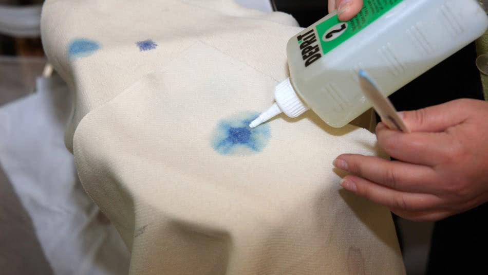 - Перед очисткой кляксу нужно замыть в холодной воде, протереть этиловым спиртом или уксусом.