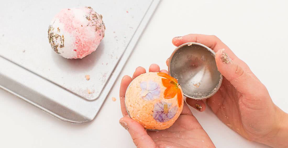 Бомбы для ванны являются средством, в составе которого содержатся специально подобранные композиции масел, трав, грязей, глин и прочих сухих ингредиентов. Внутри некоторых вариантов содержатся блестки или цветочные лепестки. Такие шипучие шарики иногда называют гейзерами, они известны своими целебными свойствами. Один из основных компонентов, которым является пищевая сода, очень хорошо действует против зуда, раздражений кожи, а шипеть шарики для ванны заставляет лимонная кислота. Придать любой цвет им можно с помощью натуральных красителей.