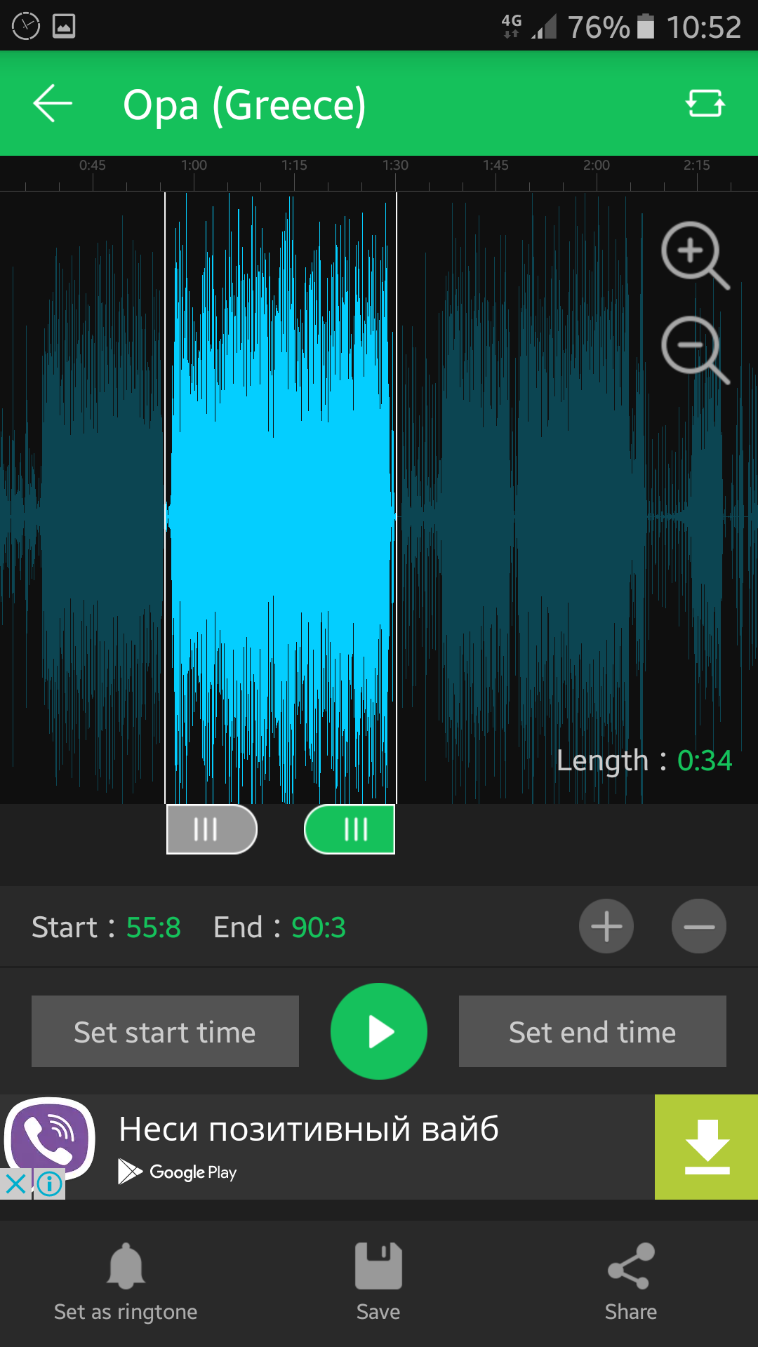 Шаг 3. Вы попали в раздел, где редактируется трек. Здесь можно увидеть звуковые волны, выполненные в графическом виде. Вам необходимо выделить фрагмент, который будет использоваться в качестве рингтона. Для этого предназначены ограничители, на каждом из которых нарисованы три вертикальные полоски. Запустить воспроизведение выделенного участка можно нажатием соответствующей зеленой кнопки, расположенной в нижней части экрана. Масштабирование музыкального трека осуществляется путём нажатий на кнопки с изображением лупы.