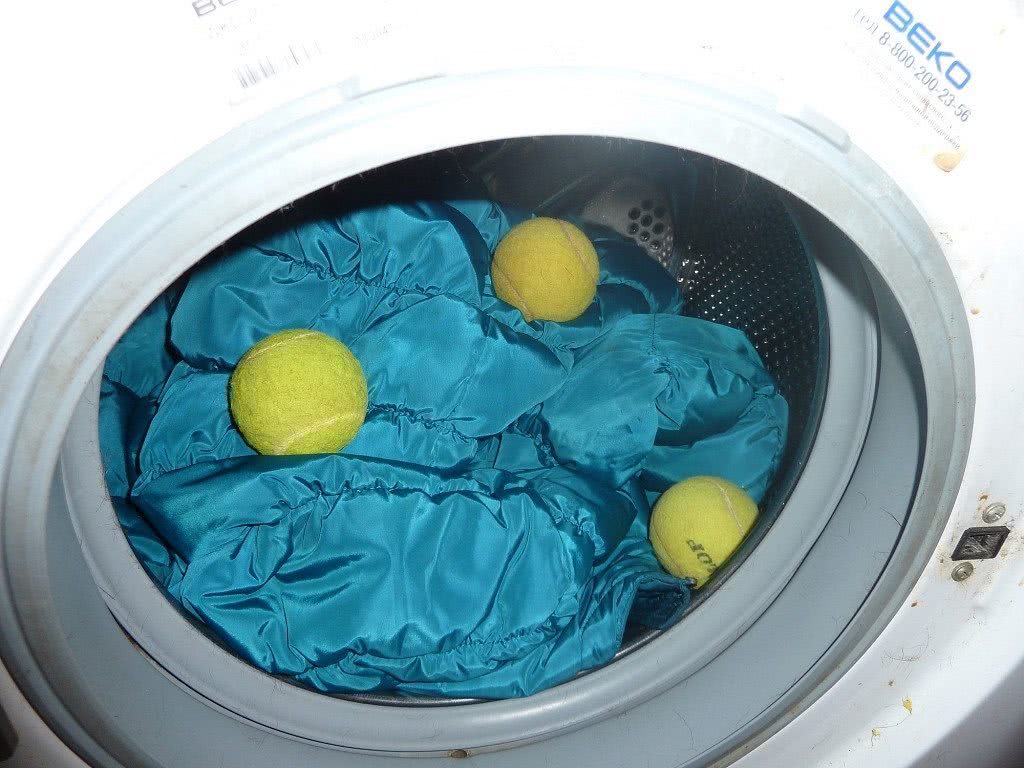 При стирке пуховика в домашних условиях есть один секрет, помогающий гарантированно сохранить красивый внешний вид и функциональность изделия. Добавьте в барабан три теннисных мячика для предотвращения образования комков пуха.