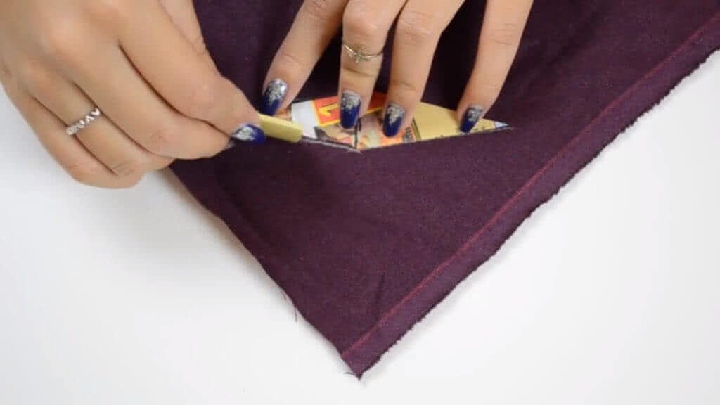 - Кусок ткани приметывают или фиксируют булавками с одной стороны и пришивают на машинке внутренним швом.