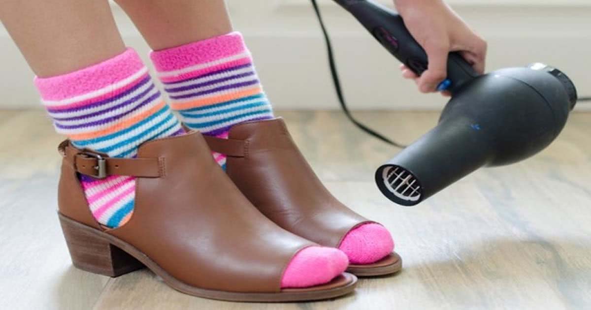 - Также можно разогреть туфли феном, быстро обработать их спреем и надеть на ногу с зимним носком.