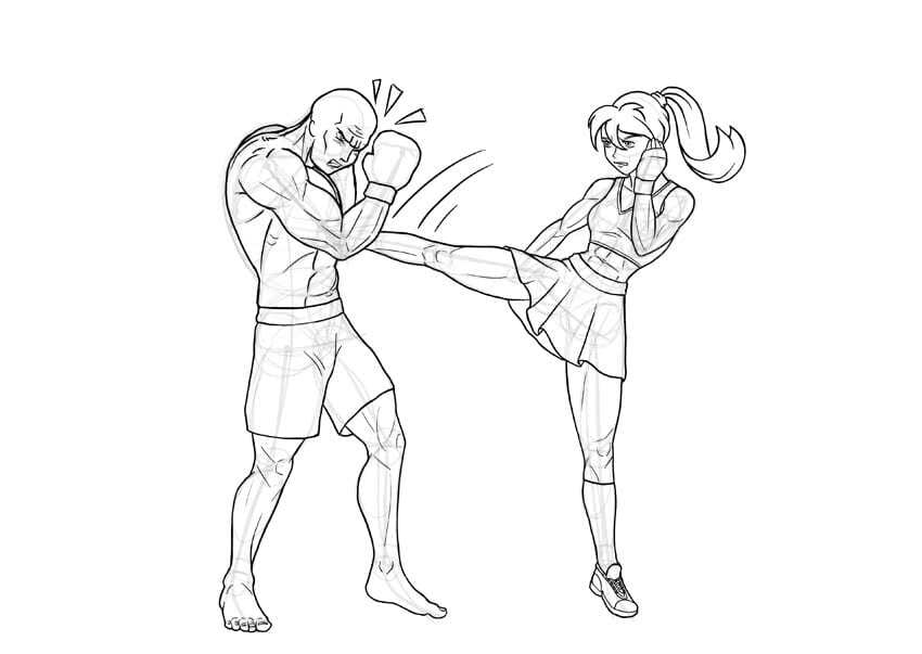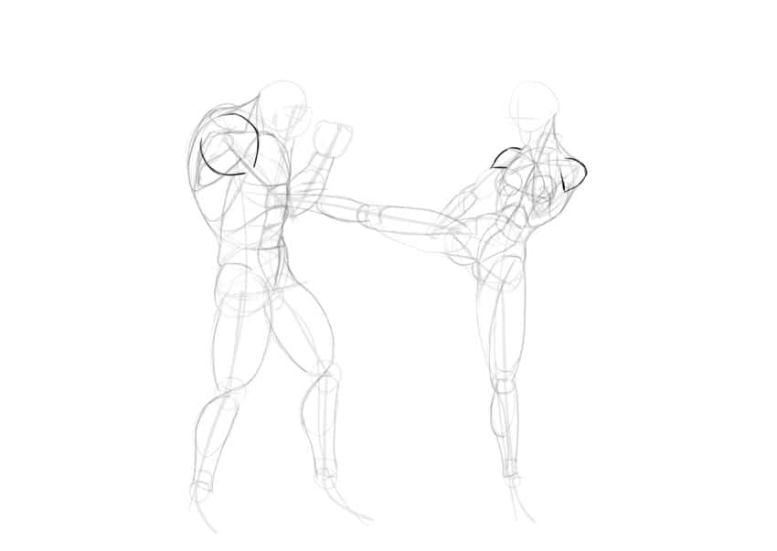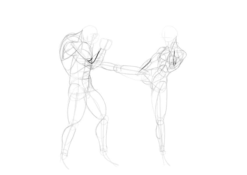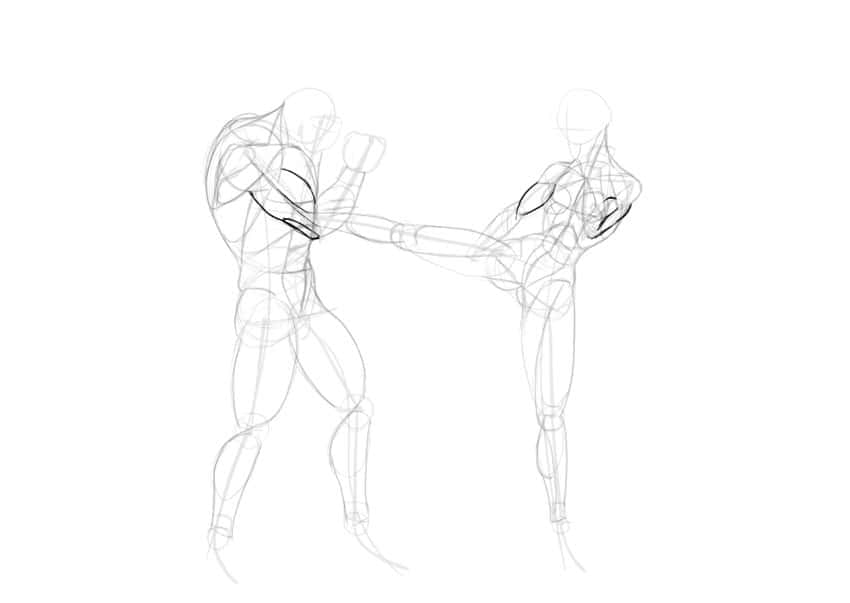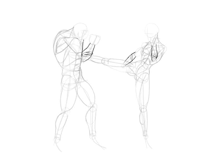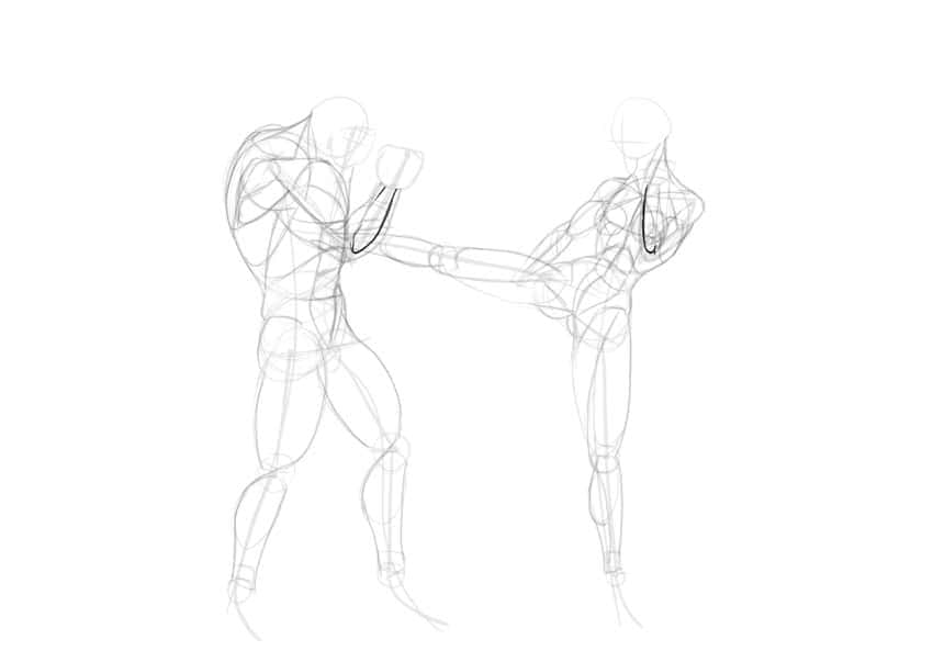 Теперь перейдем к практике. Для начала рисуем туловище. Внимательно подгоните перспективу под позы бойцов. В аниме такие динамические позы редко рисуют в обычном виде спереди или сбоку.