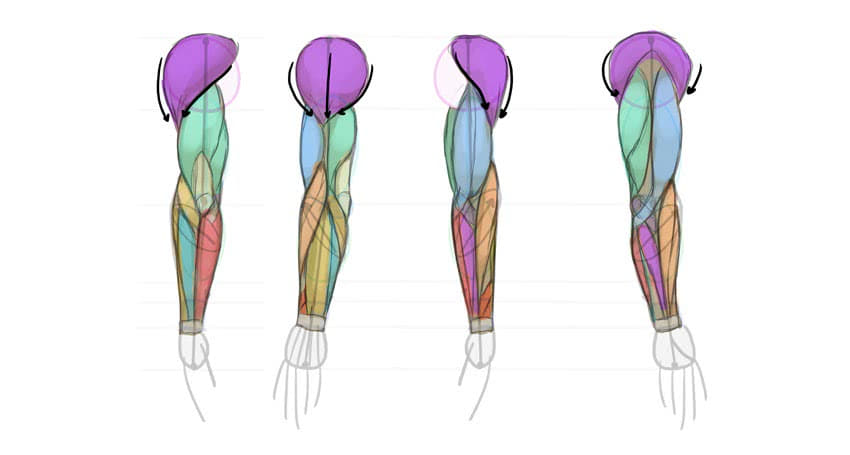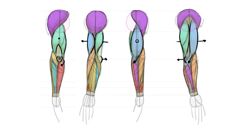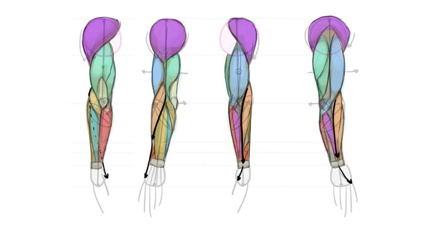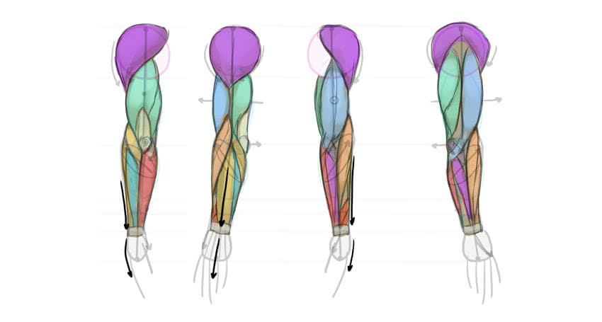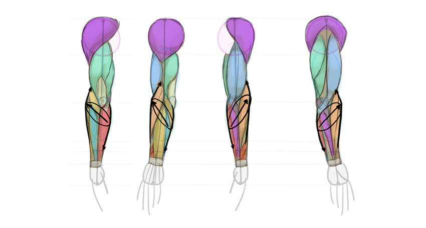 Для начала нужно уделить внимание предплечью. Его форма меняется в зависимости от поворота и положения руки