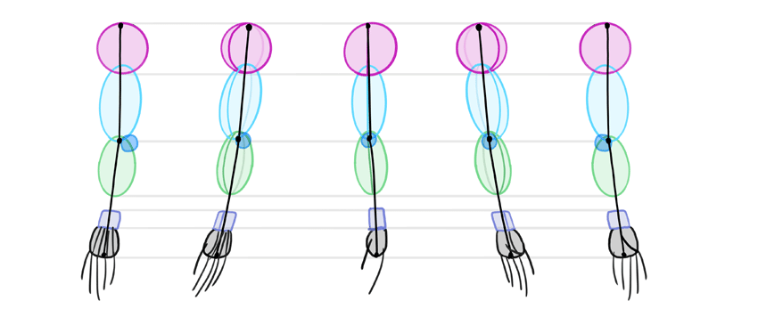 Давайте посмотрим на каждую деталь тела по отдельности. Туловище все еще похоже на песочные часы. Главное, не забывайте о наклоне грудной клетки по отношению к бедрам.