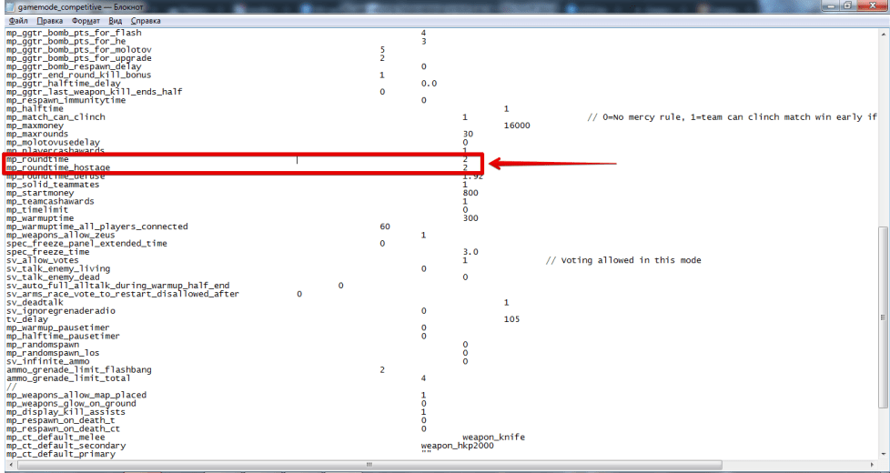 Для этого нужно открыть файл конфигурации «gamemode_competitive.cfg», который расположен по адресу –C:\Program Files (x86)\Counter-Strike Global Offensive\csgo\cfg\. Затем его необходимо открыть и найти надписи: « mp_roundtime2» и «mp_roundtime_hostage 2». Эти цифры указаны по умолчанию и устанавливают длительность раунда в минутах.