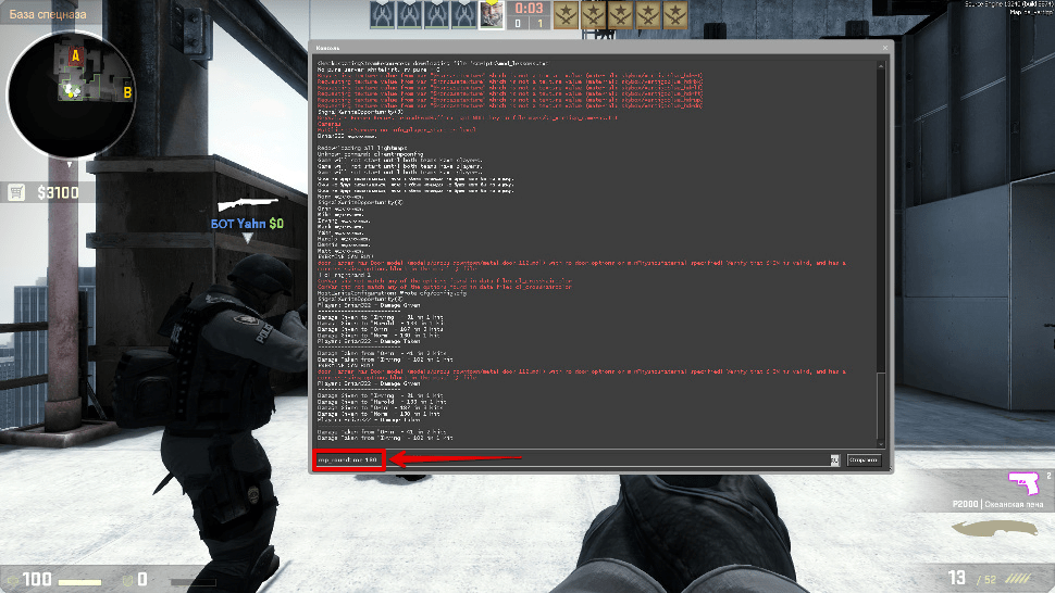 mp_warmup_start – включить разминку;mp_do_warmup_offine 1 – если не работает разминка;mp_warmuptime 60 (время в секундах) – время разминки;mp_warmup_end – закончить разминку;mp_roundtime 60 (время в минутах) – продолжительность раунда;mp_freezetime 0 (время в секундах) – убрать задержку перед началом раунда;mp_maxrounds 100 – задаёт количество раундов;mp_timelimit 60 – указывает максимальное время матча;mp_maxmoney 30000 – максимально кол-во денег ;mp_startmoney 16000 – количество денег в начале раунда;mp_buy_anywhere 1 – активирует покупку в магазине по всей карте;mp_restartgame 1 – перезапуск игры;mp_death_drop_gun 0 – у игроков не выпадает оружие после смерти;sv_cheats 1 – возможность включение читов, и настройки сервера;sv_infinite_ammo 1 – бесконечные патроны;r_drawothermodels 2 – включает WH;mat_wireframe 1 – подобие WH, но только лучше;god – бессмертие;noclip – полёт сквозь стены;cl_leveloverview – вид на карту сверху;sv_showimpacts 1 – выстрелы оставляют следы;ent_fire !self addoutput “max_health 1000” – сделать максимальное количество HP.
