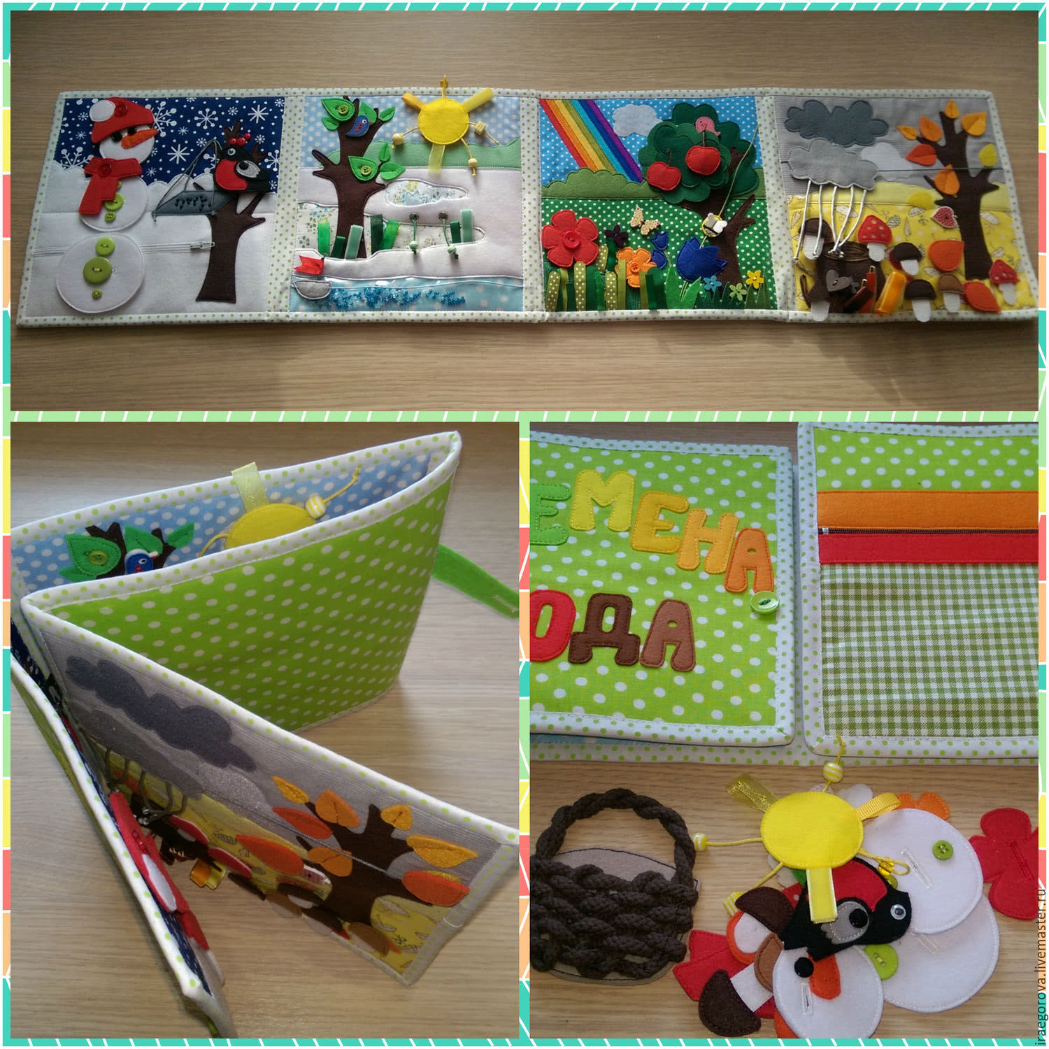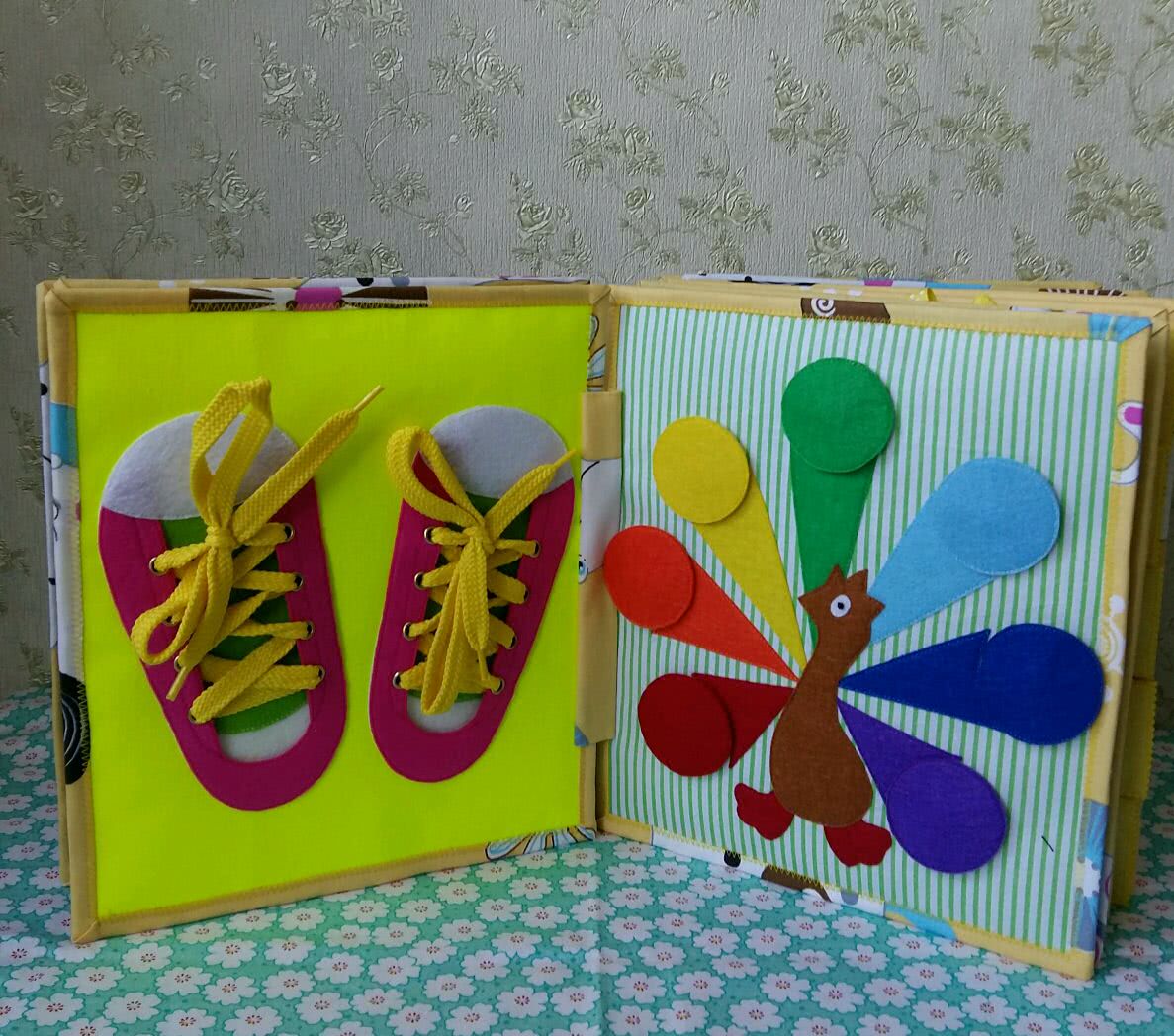 Из фетра, ткани (с большими и мягкими элементами, липучками, вкладышами, бусинами, пуговицами) – для самых маленьких. Такие книги-игрушки обогащают тактильные ощущения малыша, развивают мышление, мелкую моторику.
