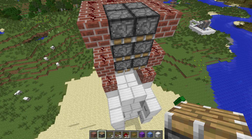 Прежде всего, постойте конструкцию в форме буквы «П» с шириной в три блока и высотой в два. Следующие этажи стройте уже в форме полой трубы с размерами 3*3. Теперь разместите в шахматном порядке таблички и воду