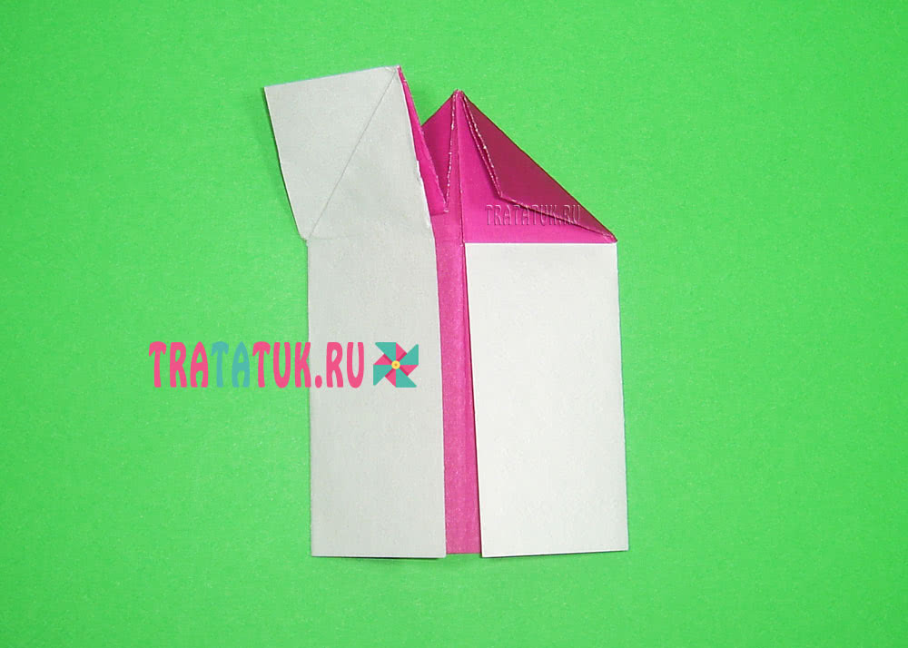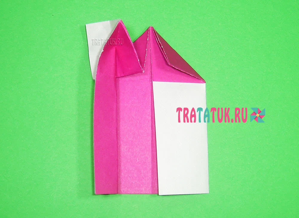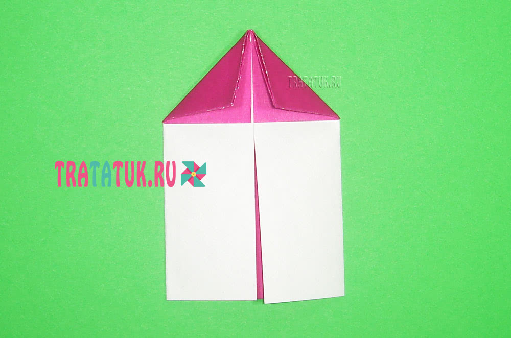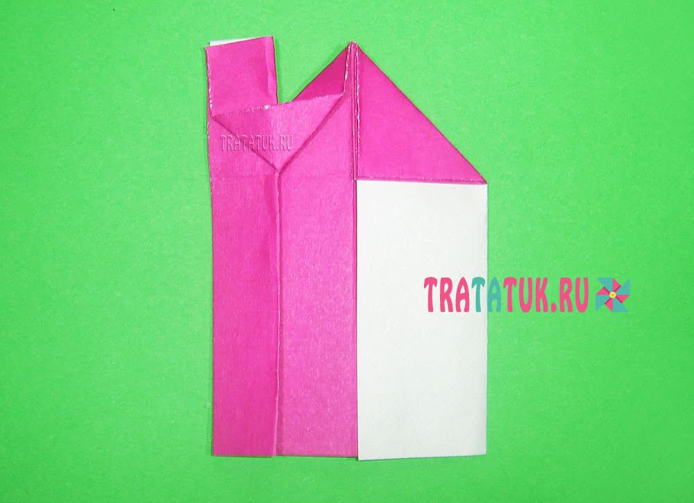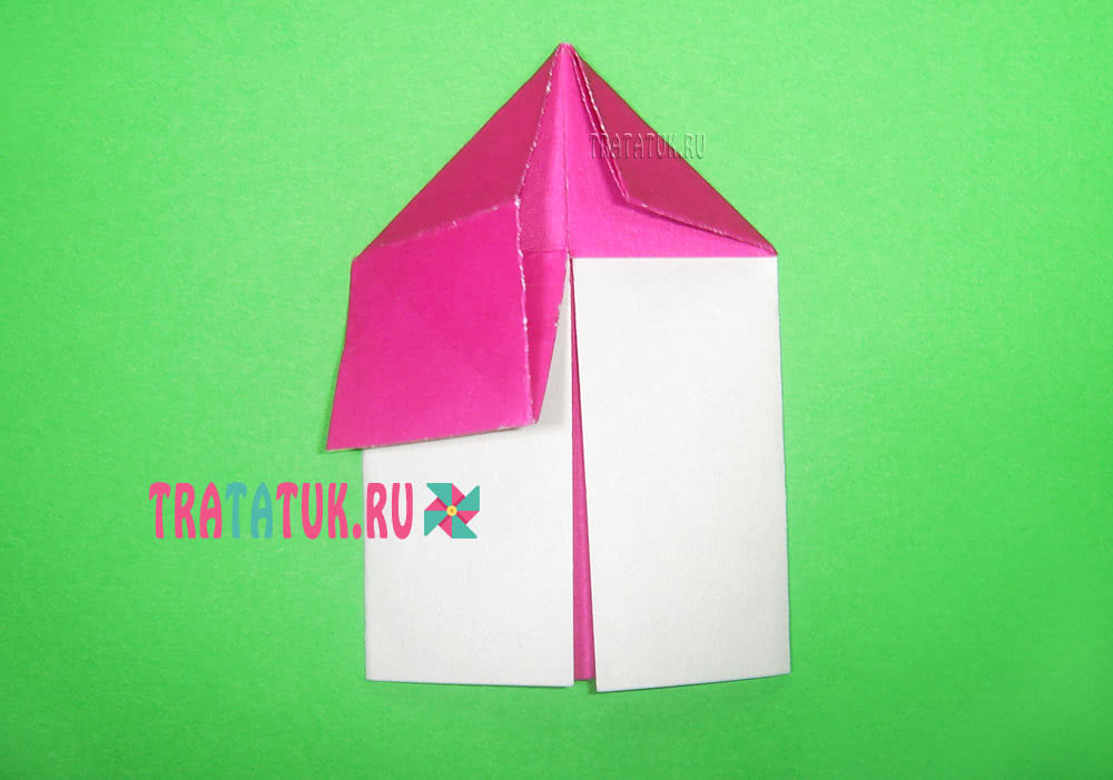Загните вверх нижнюю часть домика, выравнивая края по нижней части крыши. Но здесь могут быть варианты, можно загнуть меньше и будет прямоугольный длинный дом, либо квадратный.
