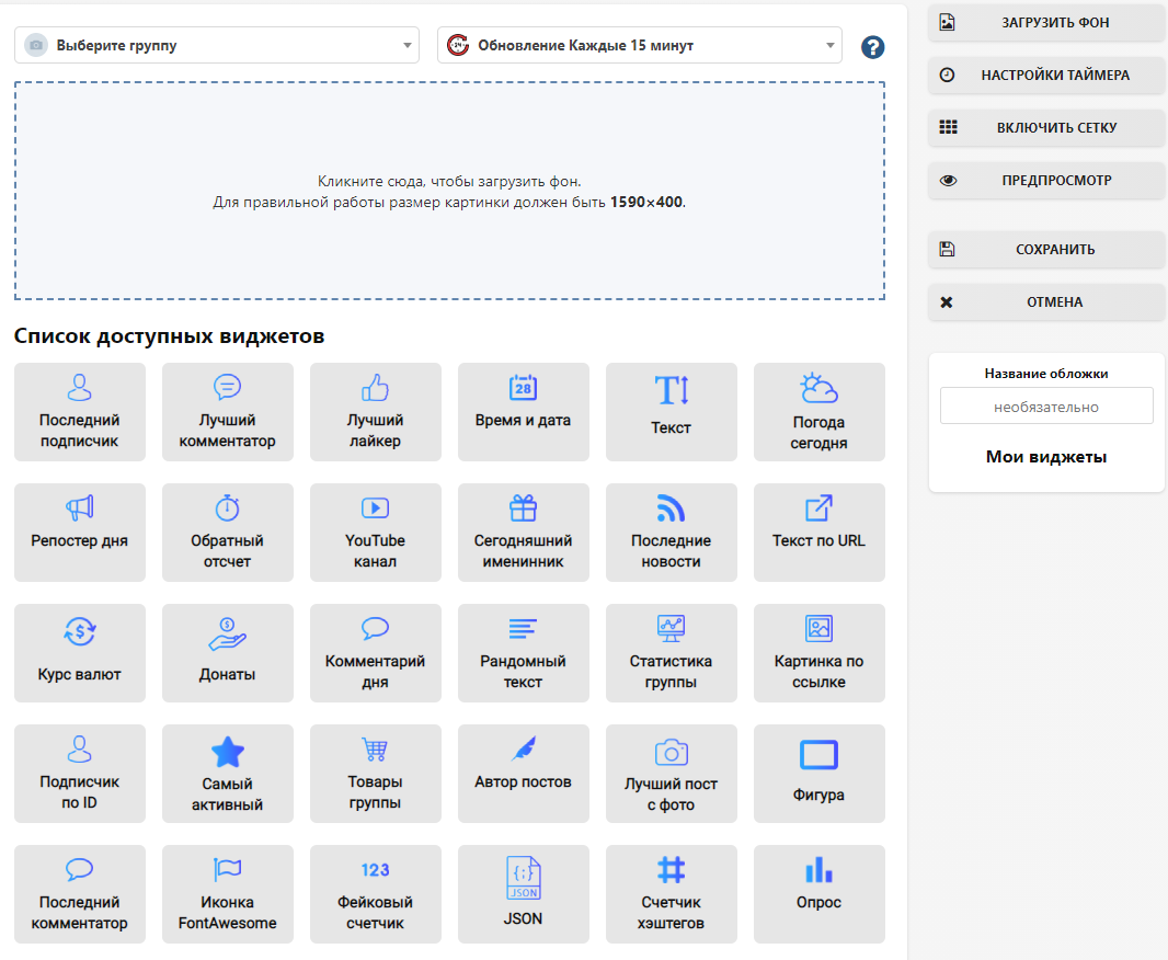 Чтобы создать динамическую обложку в LetsCover, достаточно загрузить фон-картинку и разместить на нем необходимые виджеты. Это может быть «последний подписчик», «лучший комментатор», «репостер дня», «сегодняшний именинник» и т.д. Всего доступно 30 виджетов.