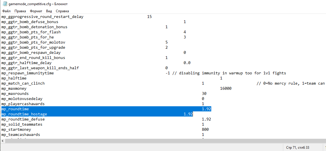 Чтобы добавить время раунда в КС ГО, достаточно внести новую величину. Допустим, это 15 минут, или 30, как пожелаешь. После этого сохраняешь изменения в файле и запускаешь игру.
