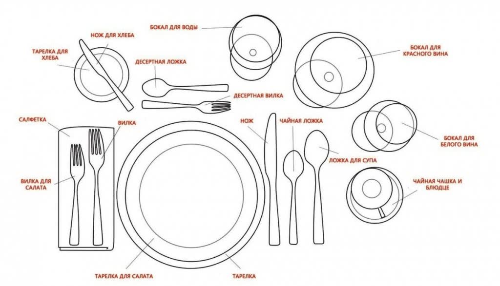 • Слева лежит вилка, а справа нож, как и ложка. • Вилка должна лежать зубьями вверх, а нож лезвием к тарелке. • Если в меню больше чем три блюда, то не нужно выкладывать все столовые приборы, они должны выноситься тогда когда будут нужны. • С тарелкой должны быть вилка и нож, после них для рыбы, далее нож и вилка для различных салатов. • Ложку можно расположить вместо вилки для рыбы.