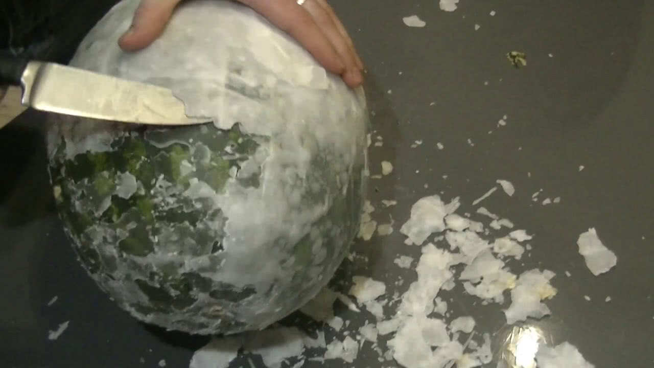 Покрыть парафином. Вариант похож на предыдущий, глиняный, но здесь маска для арбуза требуется восковая или парафиновая. Одну из смесей необходимо растопить, затем несколько раз нанести на плод. Толщина покрытия должна составить примерно 1 см. Арбуз в застывшей парафиновой оболочке также помещают на хранение в прохладное место.