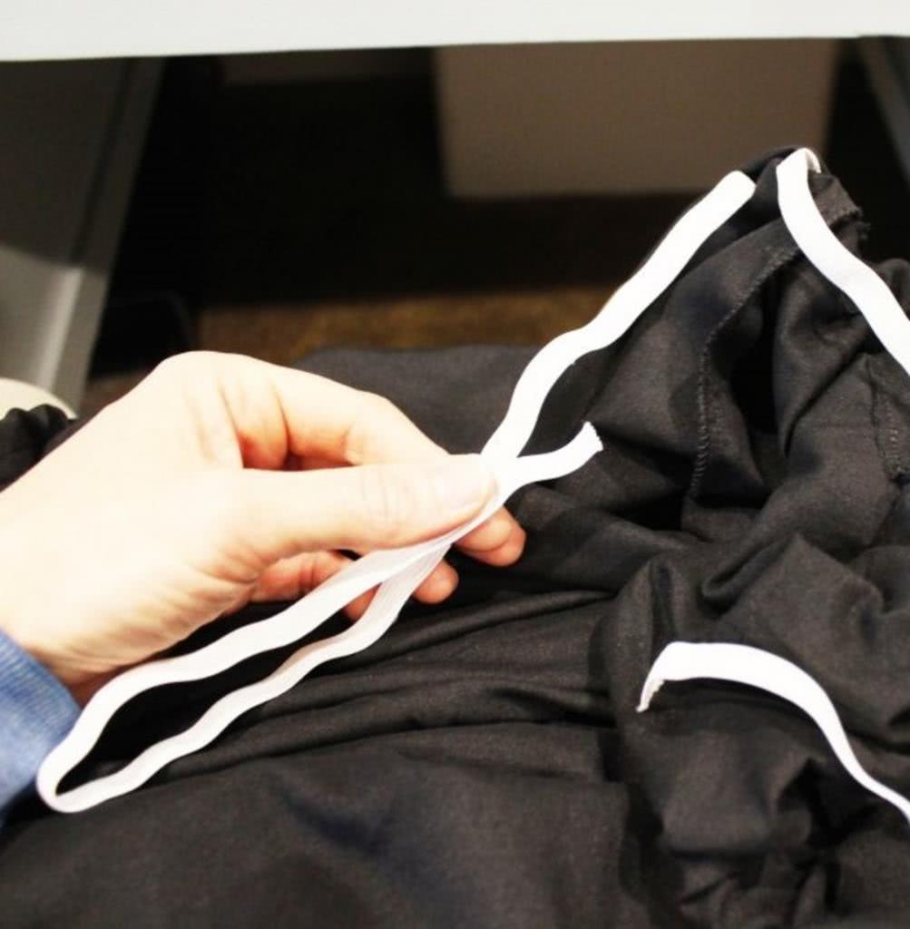 В нашем случае потребовалось 4,2 м резинки, шириной 1,2 см. Этот размер может быть меньше в зависимости от размера вашего матраса, а также от навеса ткани по его высоте. Для меньшей высоты потребуется немного больше эластичности (и наоборот).