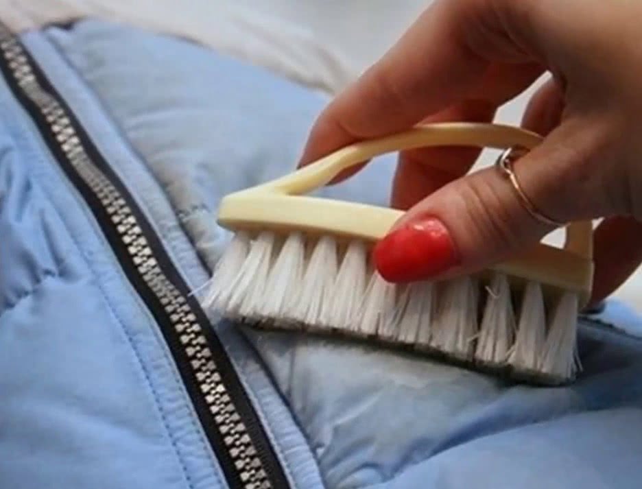 Чистящее средства – обязательно жидкое, иначе могут быть разводы на одежде. Отбеливатель используется только если пуховик белый.