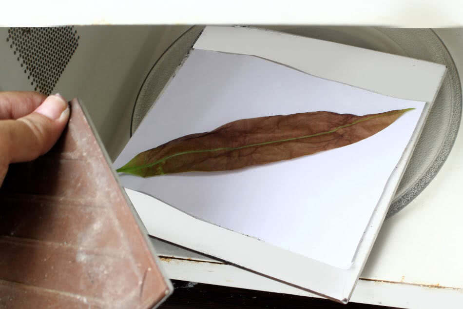 - Ни в коем случае не нужно сразу устанавливать большое время, так как листья просто сгорят. Если нет желания использовать банку с водой, можете выложить листья на влажную ткань.