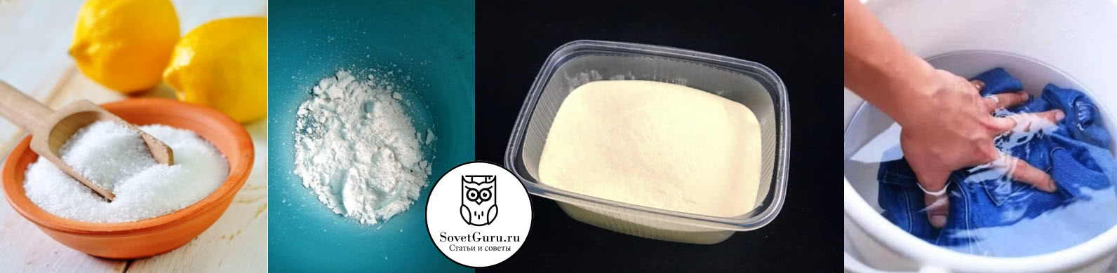 Такие средства применяются тогда, когда есть необходимость очистить джинсовую ткань от ржавчины. Эти два компонента необходимо смешать до консистенции густой кашицы. Объем выбирается самостоятельно, в зависимости от уровня и объема загрязненности. Состав наносится на пятна и оставляется на пару часов. Вещь полощется и хорошо стирается.